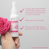 Topida Intimate Hygiene Spray is our most effective product for people keen to use the best and most hygienic natural intimate care. This effective, quick-acting solution balances the pH levels and essential nutrients help maintain skin cells and mucosa in a viable and healthy condition.